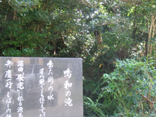 滝というより山の湧き水が流れ落ちるこの滝は、勧進帳で有名な安宅の関を通った義経一行が、ひとときの休息を取った場所と伝えられています。安宅の関守富樫氏が酒を差し入れ、開かれた宴の中で弁慶がほら貝に滝の水を汲んで飲み、「これなる山水の、落ちて巌に響くこそ、鳴るは瀧の水」と詠い、延年の舞を披露したといわれています。この歌から名づけられたのが鳴和の滝です。