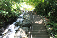 金沢中村記念美術館から石川県立美術館や石川県立歴史博物館などの文化ゾーンへと続く急勾配の長い階段。藩政時代には本多家の邸内にあり、上屋敷と下屋敷を繋いでいたようです。道の両側に生い繁る木々からはフィトンチッド(森林などの木々が発する爽やかな香り)が降り注ぎ、小径の隣には辰巳用水が滝のように流れ落ちる、町なかの隠れたヒーリングスポットです。