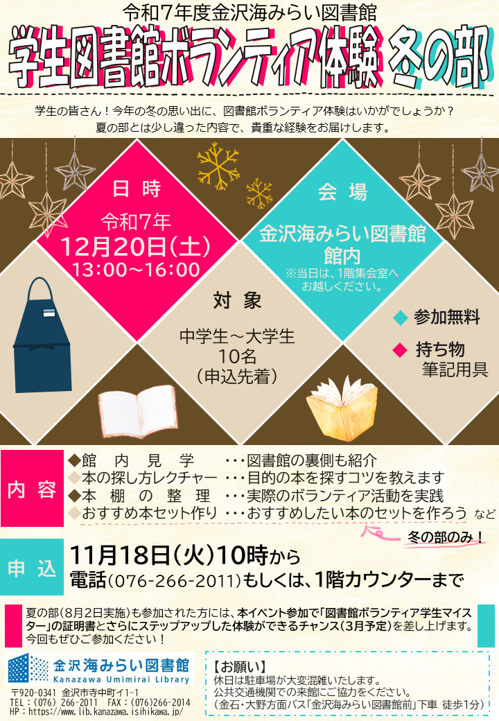 - 今冬も図書館ボランティア体験イベントを実施します!図書館に興味のある学生さん必見です。