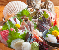 ビールケースのイスにとろ箱のテーブル、漁網や大漁旗など、漁師小屋風の演出が楽しい店内。毎日、県内各漁港から届けられる鮮魚を使用し、店内の一角には生け簀も備えている。刺身5種盛り、ホタテや殻付カキなどの貝類のセットがおすすめ。