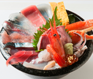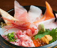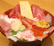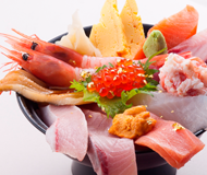 魚介は地物を中心に扱い、米は白山麓鳥越地区のコシヒカリ、酢は白山麓鶴来地区の純米酢、水は白山の伏流水を使用している。おすすめは、写真の近江町市場丼をはじめ、厚切りネタが約15種のる特得近江町盛など。