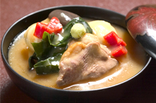 藩政時代から伝わる加賀料理の代表格がこちらの煮物。鴨または鶏肉、すだれ麩、しいたけなどを煮てとろみをつけた料理で、わさびを添えていただく。