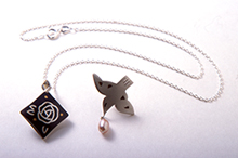 金属などに紋様を彫り込み、そこに別の金属をはめ込む象嵌。その伝統技法を受け継いだペンダントやブローチなどが人気を集めている。※すべて一品もののため、写真は参考。