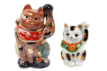福を招く招き猫。九谷焼ならではの五彩を用いた猫や、ユニークな表情の猫など、形やサイズはいろいろ。お気に入りの猫ちゃんをどうぞ。