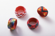 繊細な幾何学模様とビビッドなカラーがコラボしたゆびぬきは、アクセサリーのような美しさ。もとは加賀友禅のお針子さんが余り糸で作っていたとか。