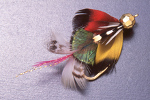 鮎釣り用の加賀毛針をアレンジしたブローチ。天然の野鳥の羽を使い、意匠を凝らした繊細で華麗なブローチのほか、ピアスやチョーカーなどもある。