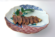3枚開きにして干したふぐを粕漬けにしたもの。粕を落として薄くスライスして食べる。ご飯のお供に、お酒のあてにクセになる味わい。