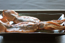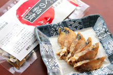 スルメイカを一匹丸ごと半生状態で一夜干したもので、新鮮なイカを使っているので、内臓は苦味もなく旨みのみ。日本海の味を堪能できる。