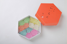 おはじき(かいちん)のような寒天菓子。パステルカラーの花や鳥が箱の中で宝石のように輝いている。表面はサクッ、中はやわらかい。