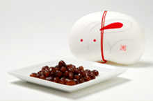 1枚ずつ手描きしたうさぎ柄の豆型うつわがキュート!中には能登半島・珠洲で栽培された「能登大納言小豆」を、柔らかく優しい甘さに仕上げた甘納豆が入っている。