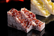 小さなキューブ状の菓子。ふわっとした口どけで、アーモンドの風味が口いっぱいに広がり香ばしくて爽やか。珈琲や紅茶にも合う。
