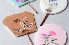 友禅柄のような花鳥風月が美しく描かれた、うちわをかたどったせんべい。1枚1枚違った模様が描かれ、食べるのがもったいないくらい。