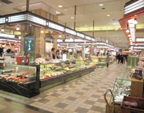 金沢駅からも近い武蔵ヶ辻にある百貨店。地下の食料品売り場には、地元の惣菜や和菓子などのギフト食品も揃い、みやげ選びにも便利。道を挟んで向かい側は近江町市場。