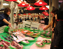 金沢市民の台所として、およそ300年の歴史。日本海から水揚げされる鮮魚をはじめ、干物や乾物、加賀野菜、精肉、花、惣菜など約180店舗が並ぶ。クール便利用なら鮮魚もみやげに。
